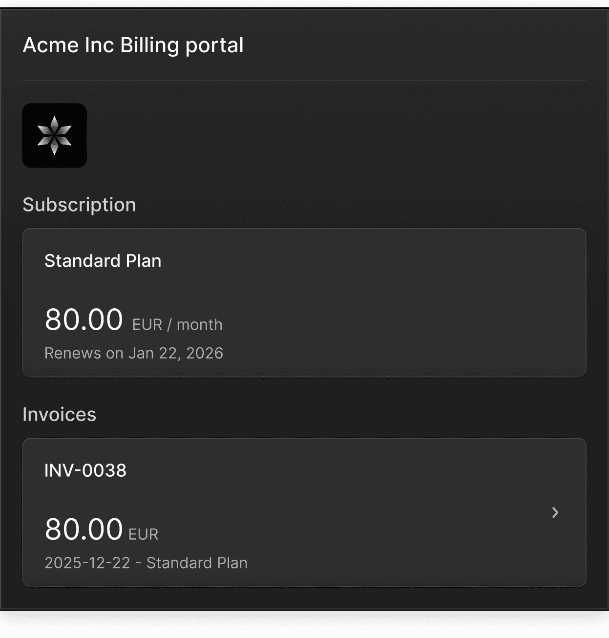 Reduce support workload and boost customer autonomy with a self-serve billing portal. Customers can view usage, manage subscriptions, update payment and billing details, and access invoices—all without opening a ticket.