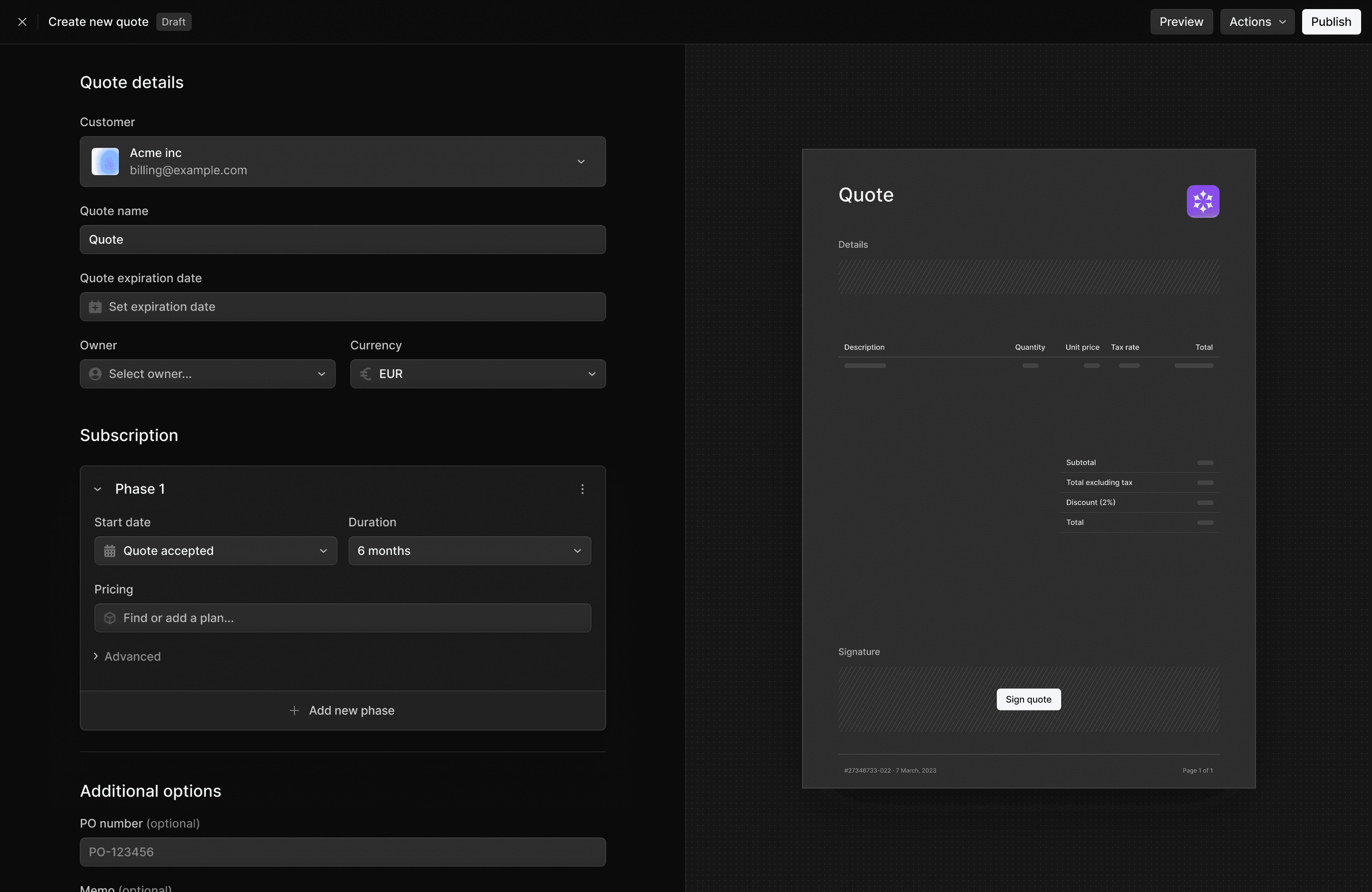 Personnalize pre-existing pricing components and discounts to generate custom quotes in seconds. Meteroid makes it easy to capture complex pricing models (tiered pricing, usage thresholds or bundles features) directly in the quote.