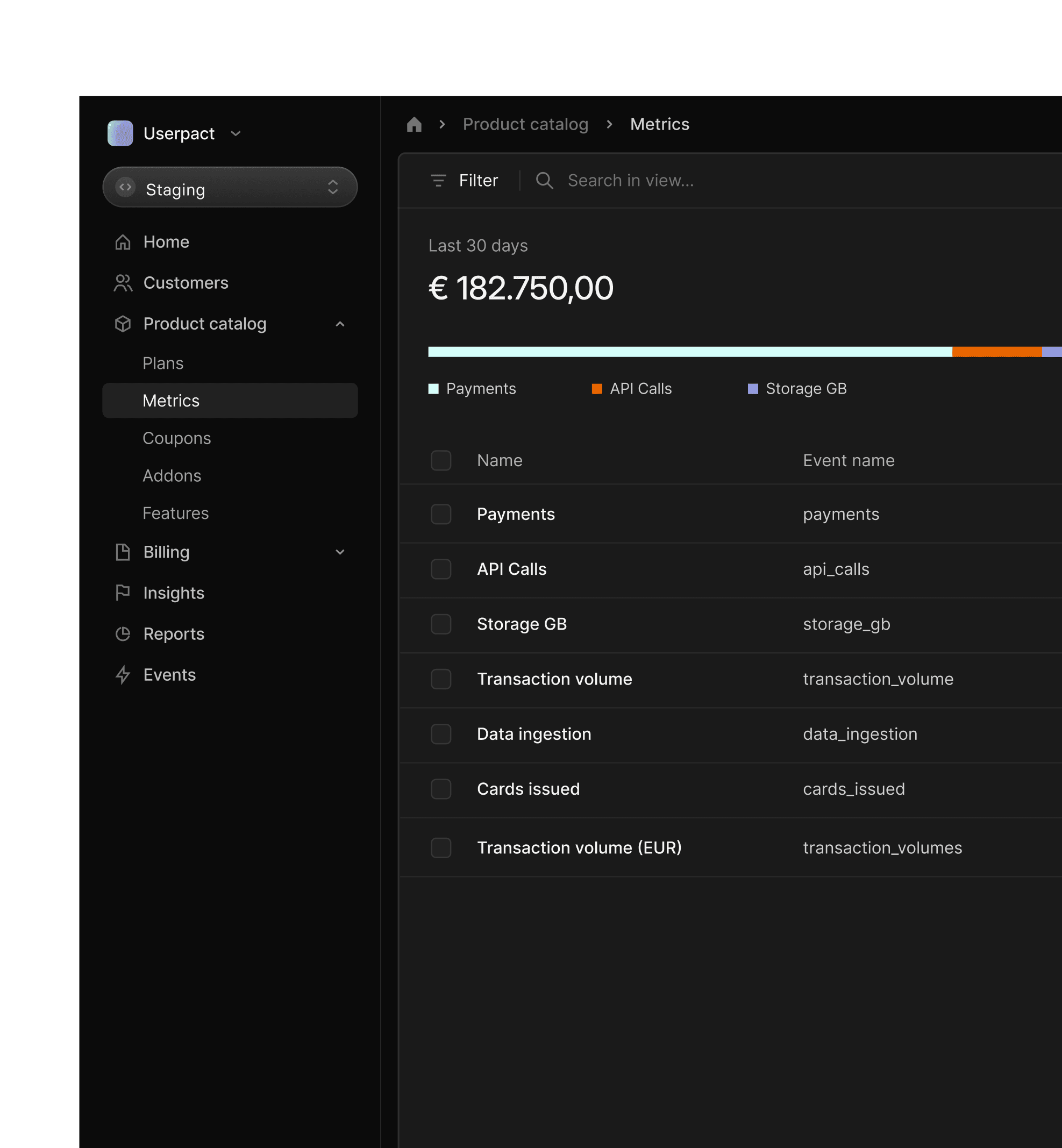 Whether it's active users, API requests, token used, transactions, or storage space, Meteroid lets you define tailored billable metrics that suit your industry and business model.